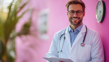 A cheerful and smiling doctor is standing in front of a bright pink wall while holding a clipboard with notes