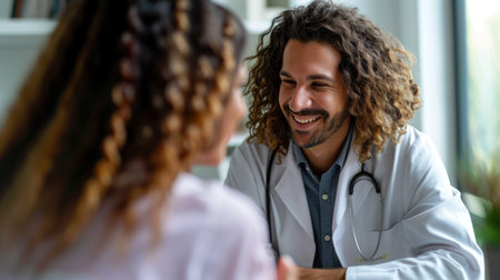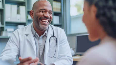 Smiling physician in white coat listening to patient in cheerful setting