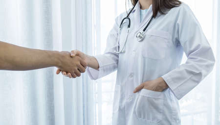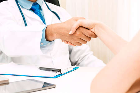 Hands of patients and doctors shaking after discuss the results of the health examination.