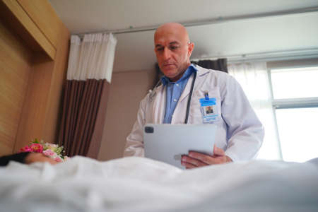 woman doctor holding x-ray on tablet and talking to women patient in ward at hospital,Healthcare concept