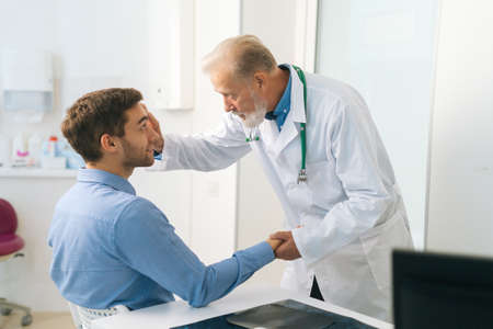 Medium shot of mature adult male ophthalmologist examining eyes of male patient during checkup visit in clinic office. Young man coming in for consultation before undergoing vision correction surgery.