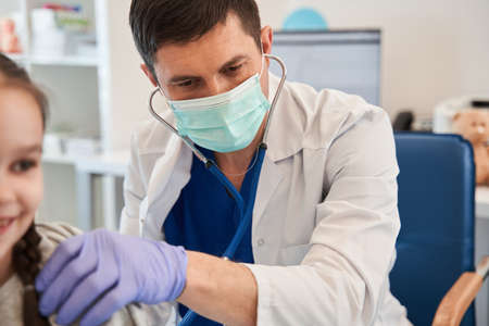 Attentive male doctor wearing protective mask examining child with stethoscope