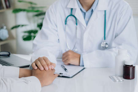 Male doctor hold hand patient to encourage and explaining treatment after writing prescription on clipboard and discussion the result of the examination of the illness to patient in clinic