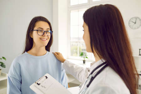 Doctor and patient. Young female patient at reception at caring female doctor who puts her hand on patients shoulder during conversation in medical office. Medical healthcare concept.