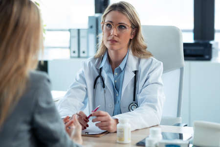 Smart doctor taking care a patient while investigate symptom. Skilled doctor wearing lab coat at clinic. Doctor takes the patients medical history, listening intently to concerns and symptoms. AIG42.