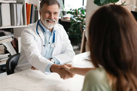 Cheerful mature doctor shaking hands to patient in the office at desk
