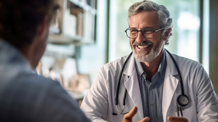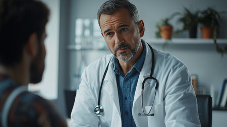 A compassionate male doctor in a white coat with a stethoscope attentively listens to a patient, emphasizing personalized care in a clinical setting.
