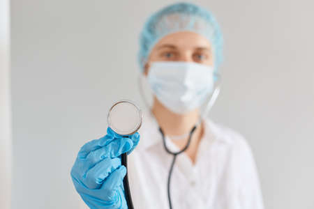 Indoor blurred shot of young adult woman doctor wearing medical cap, gloves and protective mask showing stethoscope to camera, equipment for diagnostic.