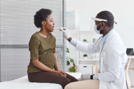African pregnant woman opening her mouth while doctor examining her throat during visit at hospital