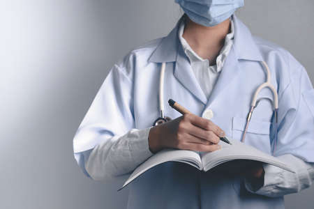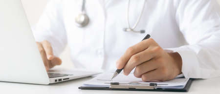 Close up of Doctor hands is working on his documents reports in his workplace.