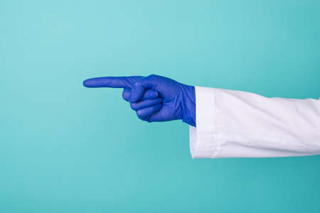 Social distance choosing concept. Close-up cropped photo of professional doctor in gloves pointing with index finger isolated on teal turquoise color background