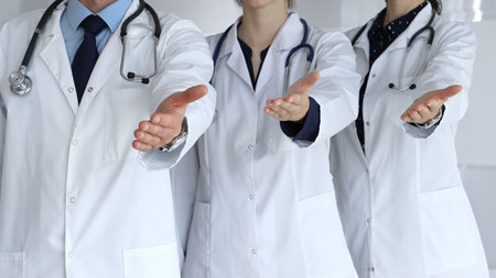 Medical team offering helping hands, extending invitation for support and showing professional care, welcoming patients to healthcare services with open palms