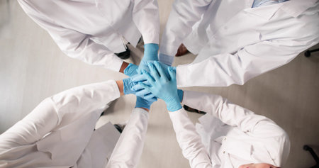 Group of unrecognisable scientists stacking and joining hands in unity and support while standing in a lab at work. Diverse group of lab workers piling their hands from above