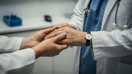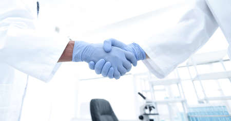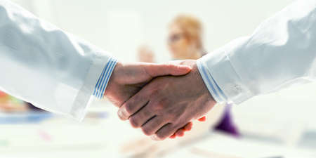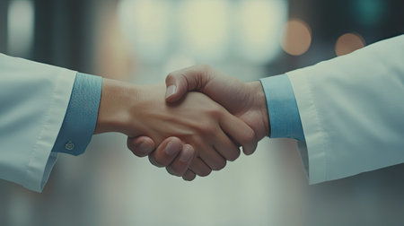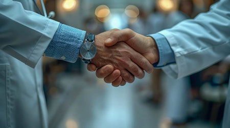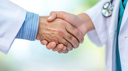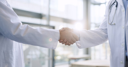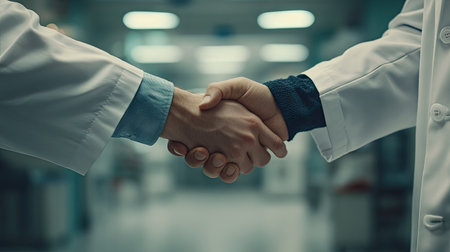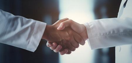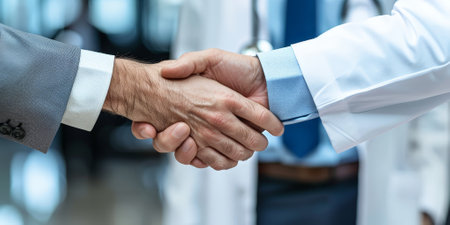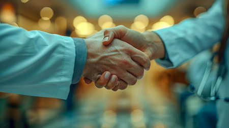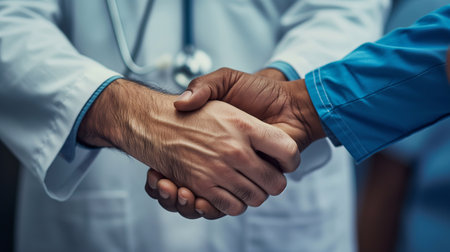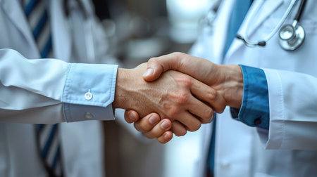 Close-up of handshake between two doctors, symbolizing support and mutual respect in medicine.