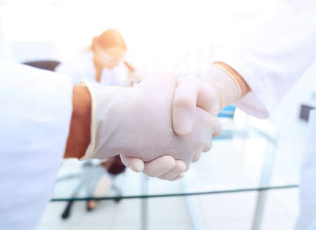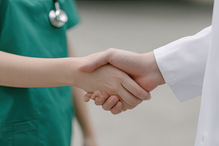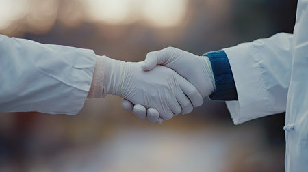 Professional handshake between two healthcare providers, close-up shot focusing on their hands in gloves.