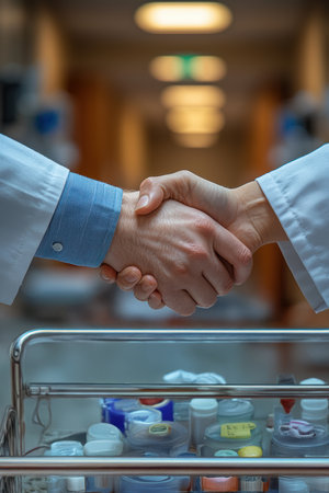 Two doctors in lab coats shaking hands, close-up emphasizing cooperation in a modern hospital environment.