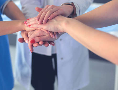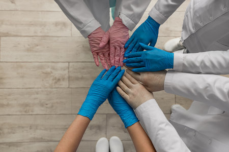 Group of doctors putting hands together in clinic, top view. Unity concept