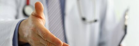 Male medicine doctor offering hand to shake in office closeup. Greeting and welcoming gesture. Medical cure and tests advertisement concept. Physician ready to examine patient
