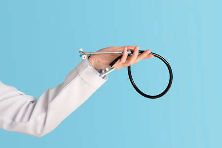 Hand of a doctor holding stethoscope disk towards the camera. Over blue background with copy space.