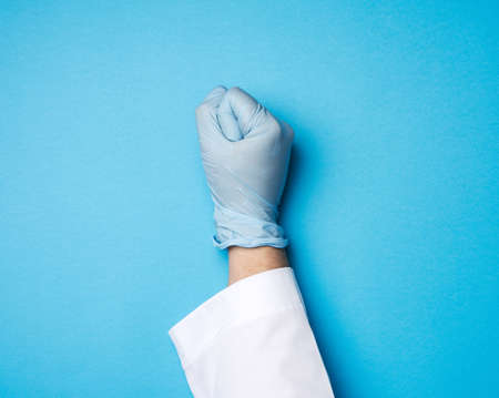 doctor's hand in a blue latex glove, the palm is clenched into a fist on a blue background, close up