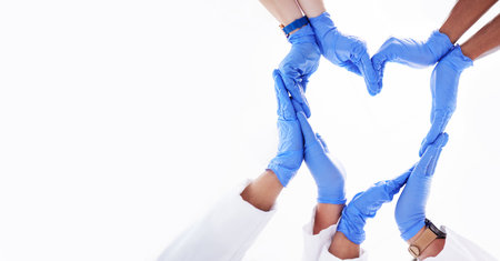 Doctors, heart and glove hands on mockup, banner and isolated white background in support. Medical team, love shape and healthcare of cardiology, wellness and hope emoji for help, medicine and trust
