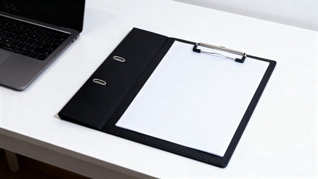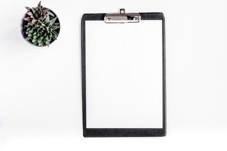 Clipboard with blank paper sheet on white table with laptop.