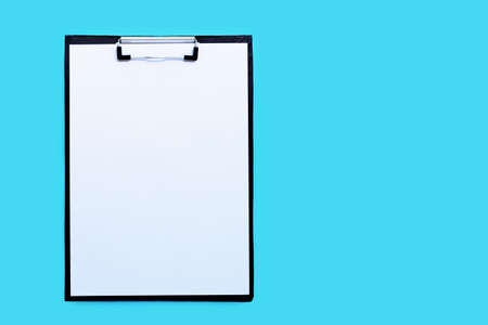 Clipboards with blank white paper sheet on blue background. Copy space