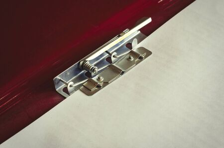 Red paper folder with clip close-up. Open folder with a metal clip. Office work, stationery. Copy space. Selective focus.