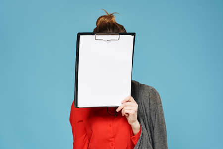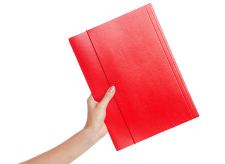 Hand holding a document folder, white background