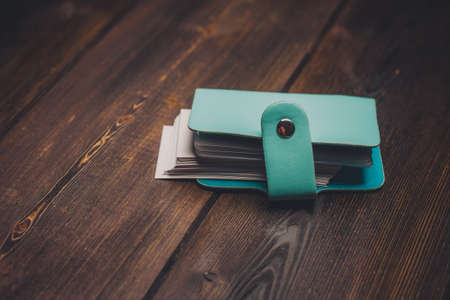 blue wallet on a wooden table business cards coin pocket