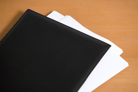 A black binder sits on a desk with sheets of documents and a colorful pie chart, perfect for showcasing organization and office productivity in a modern workspace.
