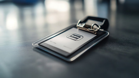 A close-up shot of a business identification badge reflecting professionalism in an office setting.