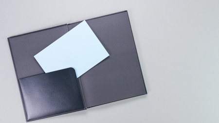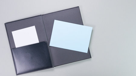 Open dark grey folder with a pocket, featuring a light blue paper inside. Suitable for organizing documents or presentations in business, education, or creative projects. Mockup for text.