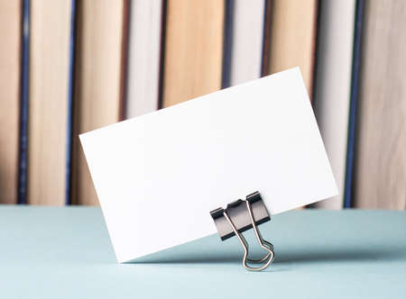 There is a white blank card with a place to insert text on the table against the background of books. Template.