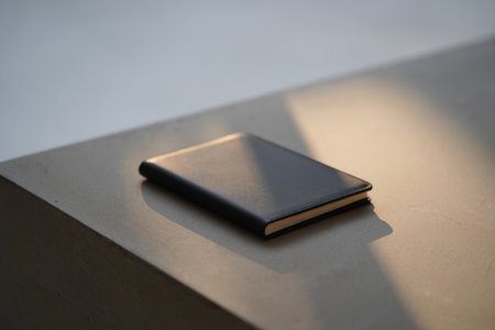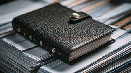 A sophisticated black leather notebook rests on a neatly arranged stack of paperwork, encapsulating an organized office atmosphere perfect for creativity and productivity.
