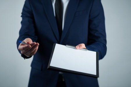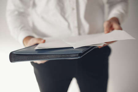 Businessman is holding klebold with white blank sheet. Conference recordings concept