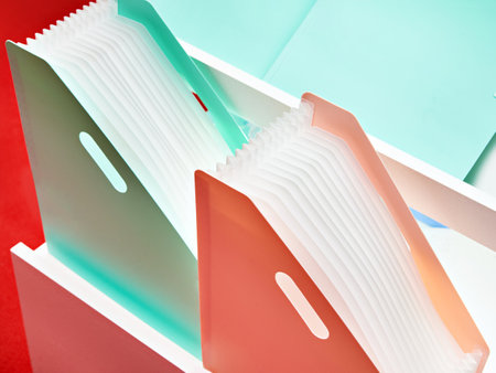 A visually appealing arrangement of colorful file folders on a blue background, symbolizing organization and productivity in a contemporary workspace setting.