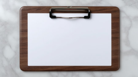 Wooden clipboard with blank white paper on dark background.