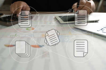 businessman manages data on a laptop and phone, business paperless document files digital electronic. concept Enterprise Resource Planning system is software for management recorded in a Database.