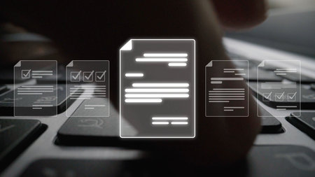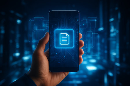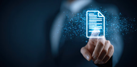 An image depicts a hand interacting with a glowing digital document icon, suggesting data access or transfer. The composition presents a dark background with blue hues. It uses visual elements to represent the concept of digital information. Suitable for illustrating technology, data management, and business themes.