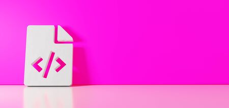 3D rendering of white symbol of paper with bent corner and code symbol icon leaning on on color wall with floor blurred reflection with empty space on right side