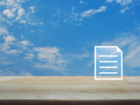 Document flat icon on wooden table over blue sky with white clouds, Business technology communication online concept