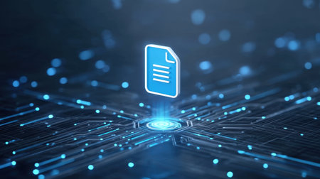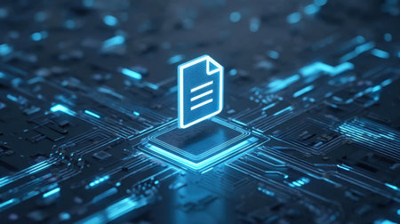 A striking digital file icon floats above a circuit board background, illuminated by glowing blue accents, representing modern technology and data transfer.