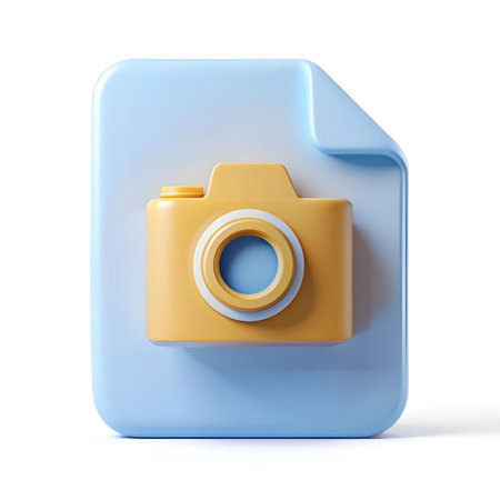 A 3D illustration of a stylized yellow camera icon on a blue file folder. perfect for representing file uploads. data transfer. or photography related concepts.