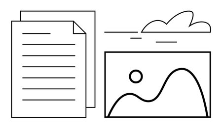 Text document, image with hills and sun, and cloud with lines. Ideal for creativity, media, workflow, blogging, storytelling visual communication and documentation. Simple flat metaphor