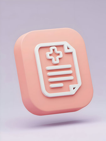A 3D render of a medical report icon on a pink square, symbolizing healthcare, medical records, and digital health solutions.