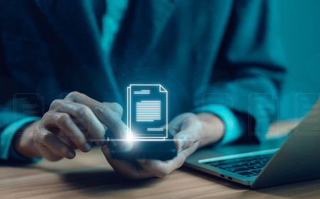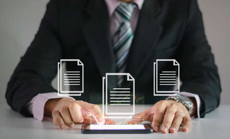 Document Management System (DMS)concept A man use checking a business graph with a hand touch screen smartphone technology