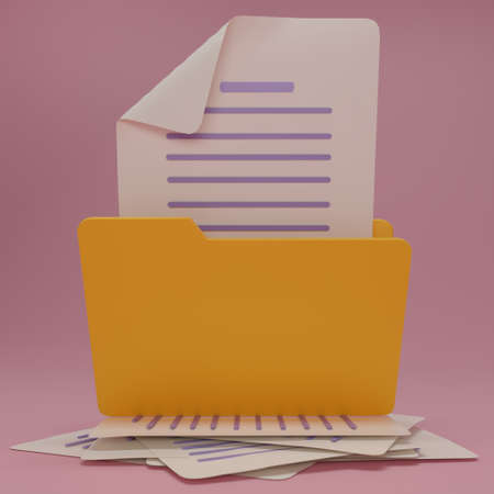 Folder with documents icon. Documents and texts in folder for graphic and web design. Paper document icon. Contract idea. Stack of agreements document. 3d rendering illustration.