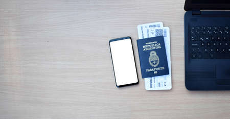 Argentine passport and boarding pass with smartphone with copy space on wooden table