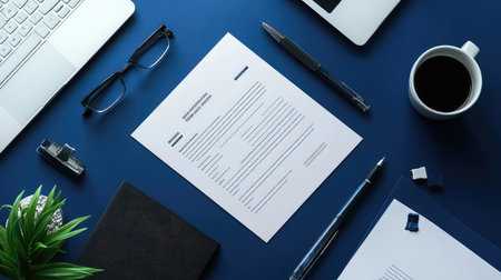 A close-up view of office paperwork and supplies on a rustic wooden desk. The image features a clipboard, pen, and a small plant, creating a productive work atmosphere.